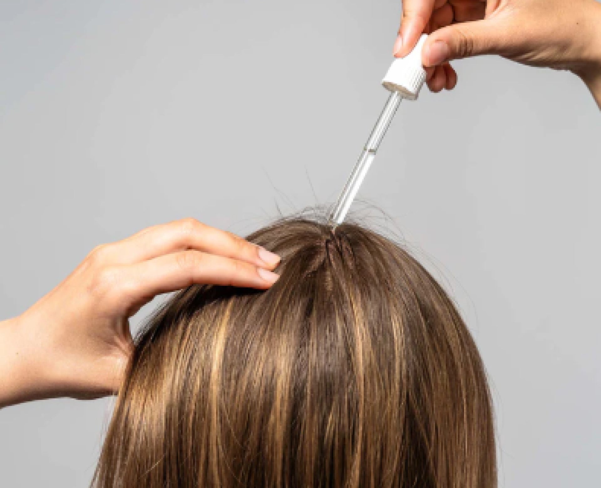 3. Posizionare la punta del contagocce vicino alla zona del cuoio capelluto che si desidera trattare e premere delicatamente il bulbo per rilasciare gradualmente la soluzione. Per evitare che la soluzione coli dal cuoio capelluto, applicare una piccola quantità alla volta.